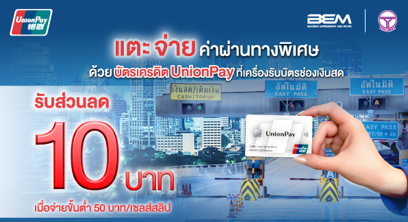 รับส่วนลด 10 บาท เมื่อจ่ายขั้นต่ำ 50 บาท/เซลล์สลิป โดยแตะ จ่าย ค่าผ่านทางพิเศษด้วยบัตรเครดิต UnionPay ที่เครื่องรับบัตรช่องเงินสด